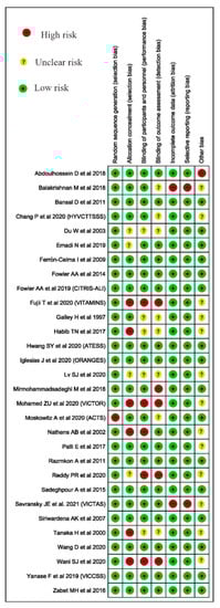 We have sought to perform the most comprehensive meta-analysis, including 48 studies in quantitative analysis evaluating the vitamin C use in critically ill patients and their clinical outcomes. We have only included studies in which vitamin C was administered parenterally. High dose oral vitamin C saturates the intestinal absorption mechanism; thus, a higher plasma concentration cannot be achieved by a higher oral dose administration. We assumed that the intravenous administration makes it possible to achieve the higher plasma concentration required to scavenge oxidizing radicals and protect from their deleterious effects. Prior meta-analyses conducted in the role of vitamin C among critically ill patients have included fewer studies than our analysis [10,11,12]. They have included studies using both oral and parenteral formulations of vitamin C, which adds to the strength of our study [10,11,12]. Our analysis is further strengthened by the subgroup analyses conducted based on the clinical settings, medical and surgical etiology of hospitalization, sepsis and septic shock, and the type of studies.