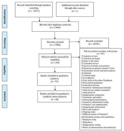 Thus, in order to fully appraise the available data, we sought to perform this systematic review and meta-analysis, including 53 studies with 352,395 critically ill patients, to evaluate the role of vitamin C, paying particular interest to the renal safety of vitamin C.