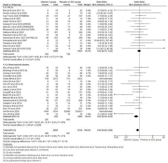 In the sepsis/septic shock group, mortality could not reach significant differences (OR, 0.73; 95% CI, 0.46–1.15; n = 340,351; I2 = 86%; p = 0.17), while among surgical patients (OR, 0.69; 95% CI, 0.56–0.85; n = 5143; I2 = 4%; p = 0.0005), a significant reduction in hospital mortality was observed comparing the vitamin C with placebo/SOC groups (Supplementary file S3, Figure S4).