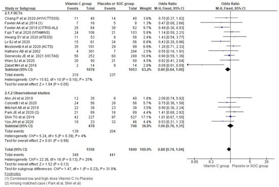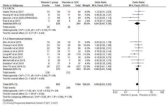 Using a fixed effect model effect, the pooling of data from 17 studies showed a 0.88 odds of 28/30-day mortality among the vitamin C group compared with placebo/SOC (95% CI, 0.74–1.04; n = 3405; I2 = 28%; p = 0.13), which could not reach statistical significance. Further, the subgroup analysis based on the type of studies showed a 0.80 odds of 28/30-day mortality among the vitamin C group among RCTs (OR, 0.80; 95% CI, 0.64–1.00; n = 2131; I2 = 37%; p = 0.05), which also did not differ significantly with placebo/SOC. Similarly, taking observational studies only also showed no significant differences across the two groups (OR, 1.00; 95% CI, 0.76–1.31; n = 1274; I2 = 4%; p = 0.99) (Figure 4).