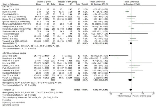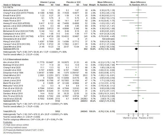 Running analysis for LoHS taking RCTs based on the blinding of trials showed a significant reduction in the length of hospital stay of the vitamin C group among both double blinded trials (MD, −0.54; 95% CI, −1.43 to 0.36; n = 1247; I2 = 34%; p = 0.24), and the single blinded/open RCTs’ reduction in LoHS among the vitamin C group could not reach statistical significance (MD, −0.78; 95% CI, −3.77 to 2.20; n = 557; I2 = 73%; p = 0.61) compared with the placebo or SOC group (Supplementary file S3, Figure S9).
