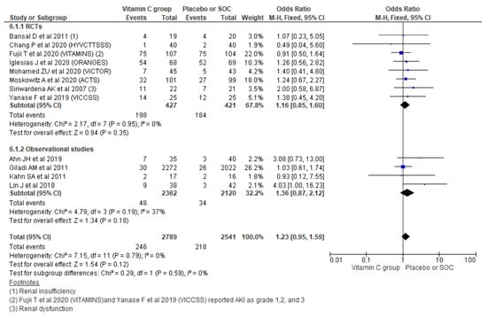 ICU pathophysiology is complex and clinical outcomes are determined several factors relating to patients’ general health and acute physiological state. This includes factors that cannot be reversed by vitamin C therapy alone and results can be confounded. Various studies in our analysis included treatment with other antioxidants such as thiamine and steroids, which can act as potential confounders. Nevertheless, our observation of no significant difference across the two groups in acute kidney injury and need for renal replacement therapy is reassuring in terms of the renal safety of intravenous vitamin C therapy and can guide future investigators.