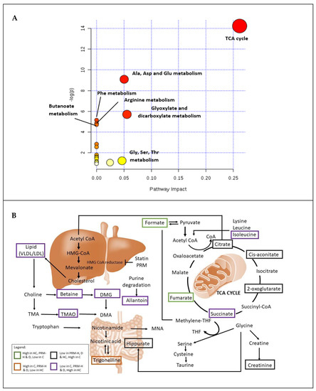 Metabolic disturbance in gut microbiota has been linked to the progression of metabolic syndromes such as obesity and diabetes [47]. Hippurate level in urine can be an indicator of the degradation of dietary fiber by the gut microbiota. Low hippurate levels in PRM-H and D groups indicate that (1) PRM-H contained low dietary fiber, and (2) PRM-H and statin might inhibit the gut microbiota biome. Apart from that, this trigonelline, a by-product of niacin metabolism (Vitamin B3), also might contribute to this result. Trigonelline in this study is significantly higher (p < 0.05) compared to the HC group. Anwar et al. [48] reported that the trigonelline could inhibit intestinal microflora involved in choline metabolism. These gut microbiota (i.e., Citrobacter genus) from choline metabolism can produce trimethylamine (TMA), which is later converted to trimethylamine-N-oxide (TMAO) by flavin monooxygenase (FMO3).