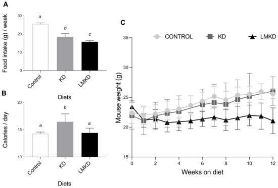 The effect of the experimental diets (ketogenic diet, KD; low methyl ketogenic diet, LMKD; and control diet) on food intake (A), calorie consumption (B) and animal growth (C). Data shown are the mean ± SD, n = 4–6/group. Means not sharing superscript letters differ by p < 0.05.