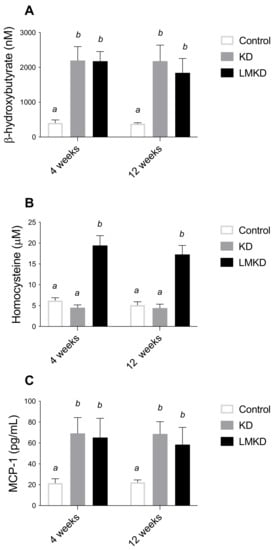 The effect of the experimental diets (ketogenic diet, KD; low methyl ketogenic diet, LMKD; and control) on the plasmatic concentrations of β-Hydroxybutyrate (A), homocysteine (B) and monocyte chemoattractant protein-1 (MCP-1) (C). Data shown are the mean ± SD, n = 4–6/group. Means not sharing superscript letters differ by p < 0.05.