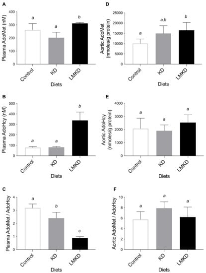 The effect of the experimental diets (ketogenic diet, KD; low methyl ketogenic diet, LMKD; and control) on the concentrations of plasma S-adenosylmethionine (AdoMet) (A), S-adenosylhomocysteine (AdoHcy) (B) and AdoMet/AdoHcy ratio (C), as well as of aortic AdoMet (D), AdoHcy (E) and AdoMet/AdoHcy ratio (F). Data shown are the mean ± SD, n = 4–6/group. Bars not sharing superscript letters differ by p < 0.05.