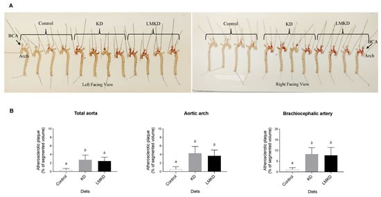 The effect of the experimental diets (ketogenic diet, KD; low methyl ketogenic diet, LMKD; and control) on aortic plaque burden. (A) Representative images of aortas from mice fed the experimental diets, after lipid staining (in red) with Oil Red-O (both sides of the aortas are shown), showing the localization of the aortic arch and brachiocephalic artery (BCA). (B) Volumetric assessment of plaque burden in different aortic segments by 14T-MRI. Data shown are the mean ± SD, n = 4–6/group. Bars bearing different letters were significantly different (p < 0.05).