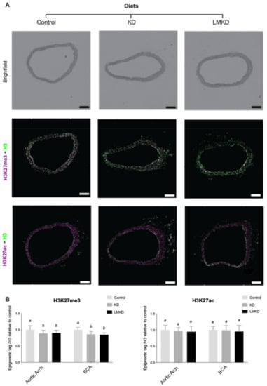 The effect of the experimental diets (ketogenic diet, KD; low methyl ketogenic diet, LMKD; and control) on the vascular content of specific epigenetic tags at lysine 27 on histone H3 (H2K27me3, tri-methylation; H3K27ac, acetylation) in the aortic arch and brachiocephalic artery (BCA). (A) Representative images of brightfield and immunofluorescence quantification of BCA cross sections. Total histone 3 (H3) in green, and histone 3 trimethylation at lysine 27 (H3K27me3) or acetylation (H3K27ac) in magenta. Scale bars = 200 μm. (B) Immunohistochemistry results. Data are the mean ± SD, n = 35. Bars bearing different letters were significantly different (p < 0.05).