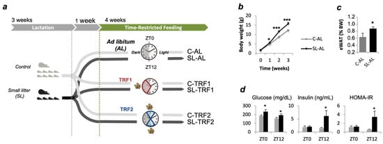 We have previously developed a mouse model of early adiposity (i.e., childhood obesity) through litter size reduction (Figure 1a) [12,13]. Mice reared in small litters grew faster that the controls (Figure 1b) and developed obesity by 4 weeks of age (Figure 1c). At the end of the 4-week intervention, the SL mice fed ad libitum (SL-AL) developed hyperglycemia, hyperinsulinemia, and insulin resistance (HOMA-IR), as determined at two independent periods of the light cycle, ZT0 and ZT12 (Figure 1d). In contrast, plasma triglyceride and cholesterol levels remained normal in SL-AL mice, when compared to the controls (Figure S1A). We tested whether two independent TRFs might effectively improve metabolism in these obese pre-pubertal mice (Figure 1a).