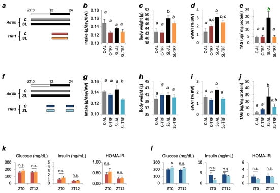 In the first intervention (TRF1) (Figure 2a), food intake was similar among the four groups (Figure 2b). Body weight and epididymal fat mass remained comparable between SL-AL and SL-TRF1 mice (Figure 2c,d). Nevertheless, hepatic triglyceride (TAG) content was reduced in SL-TRF1 mice and reached similar levels than the control mice (Figure 2e). In the second intervention (Figure 2f) SL-TRF2 mice showed reduced unintentional food intake (Figure 2g). This effect was specific to the SL group because food intake remained unaltered in the C-TRF2 group. Reduced food intake was accompanied by improvements in adiposity, which reached similar values than the C-AL (Figure 2h,i). Hepatic TAG content was also nearly normalized in SL-TRF2 mice, when compared to the control groups (Figure 2j). Finally, both interventions normalized glucose and insulin content and reversed insulin resistance in SL-TRF1 and SL-TRF2 mice, when compared to their matched controls (Figure 2k,l). Neither TRF induced major modifications in plasma TAG and cholesterol content in SL mice (Figure S1B,C).