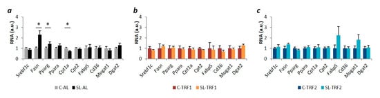 Time Restricted Feeding (TRF1) and (TRF2) restored the expression of genes involved in lipid synthesis and oxidation. (a) mRNA content (qPCR) of lipid-related genes in ad lib-fed (AL) mice (n ≥ 10 both, control (c) and small litter (SL)), TRF1 mice (n ≥ 5 both, C and SL) (b) and TRF2 mice (n ≥ 5 both, C and SL) (c). All samples were collected at the end of the 4-weeks intervention at ZT0. Data represent means ± S.E.M. * p < 0.05 versus C-AL mice.