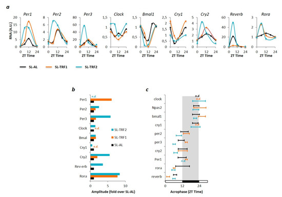 It is suggested that TRF-associated metabolic benefits are partly mediated through readjusting (peripheral) circadian rhythms [19]. Hence, we determined the hepatic expression of core clock genes, including Per1-3, Cry1-2, Clock, Bmal1, Reverb, and Rora in our mouse model. First, we found that the rhythmic expression of the clock genes was similar between young C-AL and SL-AL mice (Figure S2A). Hence, we focused our analysis on exploring whether the chrono-nutritional interventions modified patterns of rhythmic expression in the SL-TRF1 and SL-TRF2 groups, when compared to the obese SL-AL mice. As a result, we first found that the amplitudes of Per1, Cry2 and Rora were higher in SL-TRF1 mice when compared to the SL-AL group (Figure 4a,b; Table S2). Likewise, both the amplitudes and acrophases of Per1-3, Cry2, Reverb and Rora were also modified in the liver of SL-TRF2 mice when compared to the SL-AL group (Figure 4a–c; Table S2). These data suggest that both TRFs actually induced significant re-adjustments in the hepatic circadian rhythm of the SL groups. It is worth noting that the clock genes that exhibited greater re-adjustments upon the dietary interventions, namely Per1-3 and Cry1,2 are actually involved in the regulation of hepatic lipid biosynthesis [26].