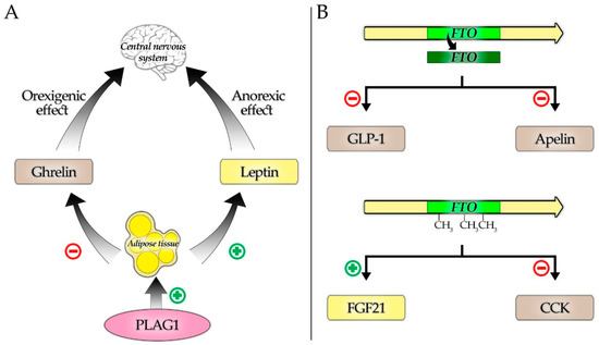 Suggested mechanisms of interactions between the studied genes and hormones. (A) Regulation of ghrelin and leptin, key appetite and satiety controlling hormones by PLAG1, secondary to its fat tissue stimulating properties. (B) Selected hormones downregulated in response to the increased FTO expression (upper part) and influenced by the higher FTO methylation (down part).