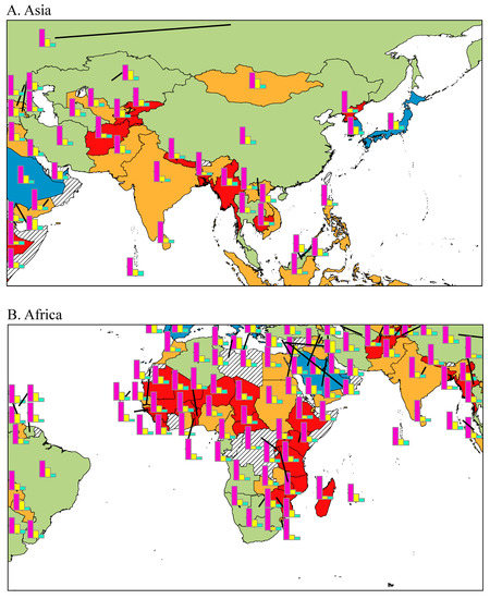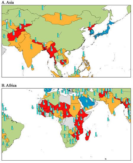 Socioeconomics data, including gross national income (GNI) and income levels, were gathered from the World Bank [11]. Income levels were categorized based on the World Bank Analytical Classifications: levels 1, 2, 3, and 4 correspond to high-income (39 countries, GNI per capita over USD 12,615), upper-middle-income (43 countries, GNI per capita; USD 4036–12,475), lower-middle-income (38 countries, GNI per capita; USD 1026–4035), and low-income (31 countries, GNI per capita under USD 1025) levels, respectively (2014). GNI per capita was derived from the Atlas method by the World Bank. The currency of GNI per capita is currently USD (2014).