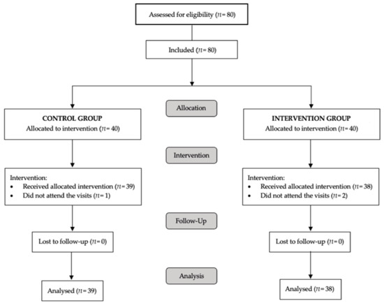 A total of 77 participants were included and received intervention; the participants had an average age of 53.5 (9.6) years, and 71.4% of the participants were women. The cumulative tobacco consumption of all the participants was 23 pack-years, with a daily consumption of 13.5 [10.0; 20.0] cigarettes and a low degree of physical activity (5.7 [2.71; 11.3] hours/week). No significant differences were found between the groups except in age (57.0 (8.81) years in the control group vs. 50.0 (9.34) years in the intervention group; p = 0.001). All sociodemographic data of the participants are shown in Supplementary Materials Table S2. A flow diagram of the study is shown in Figure 1.