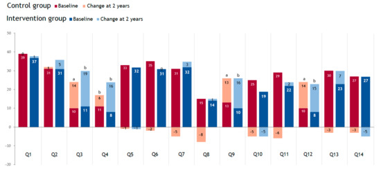 Categorical variables are described as frequencies or percentages, and quantitative variables are described as means and standard deviations or medians and 1st quartiles and 3rd quartiles, depending on whether they are distributed normal or not, respectively. A comparison between the intervention group and control group of the baseline values and an analysis of the changes over 2 years were made by using the χ2 test for categorical variables and the Student’s t-test or Mann–Whitney U test for quantitative variables, depending if they were normally distributed or not, respectively. For paired comparisons of qualitative variables, McNemar’s test was used.