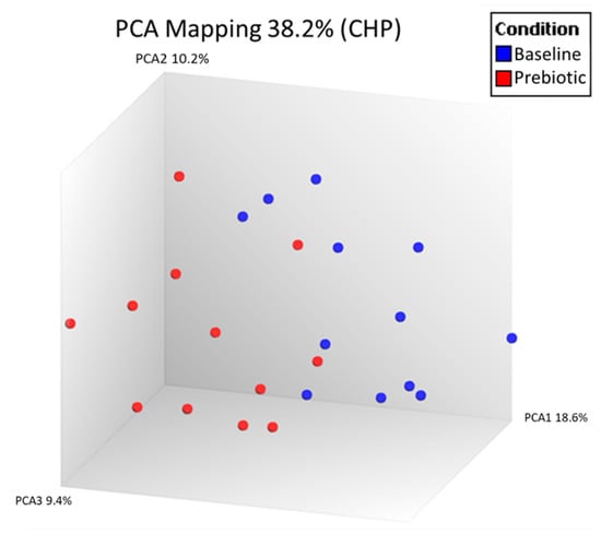 Unsupervised PCA analysis of all expressed genes was used to visually compare the peripheral blood expressed gene (RNA) profiles between baseline and prebiotics in the 12 patients with paired samples in the laboratory PP population (Figure 1).