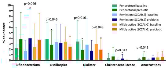 To explore the reason for the lack of bifidogenesis we performed sub-analyses of patients who at baseline were in remission (SCCAI score of ≤2; despite clinician opinion and objective evidence of active disease) and those who were not (Figure 2). We found that, in those in remission at baseline, the genus Bifidobacterium increased from a mean of 1.05% (SD 1.27) to 3.99% (5.37, p = 0.046) and the family Christensenellaceae increased from a mean of 0.58% (1.27) to 1.25% (2.47, p = 0.043) (Table 2), but no other significant changes occurred. In patients not in remission at baseline, there was no change in the genus Bifidobacterium between baseline (mean 3.23%, SD 4.91) and prebiotics (3.66%, 4.86, p = 0.753), but there was a decrease in the percentage abundance of the genus Dialister after 6 weeks (Table 2).