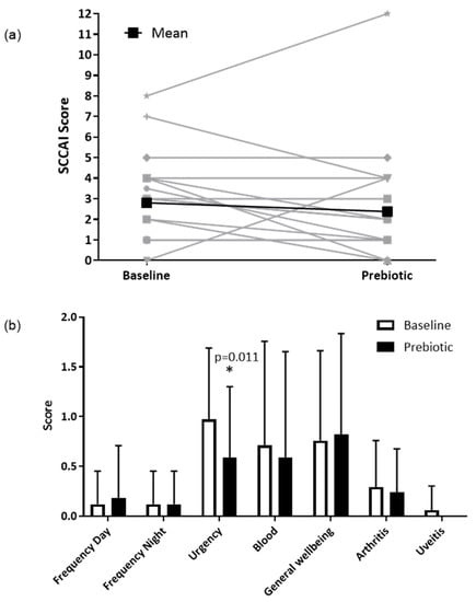 Simple clinical colitis activity index in the ITT population (n = 17). (a) Total SCCAI score at baseline and after 6-weeks of prebiotic supplementation in a 6-week open-label study of GOS prebiotics in active ulcerative colitis. Gray lines indicate individual patient data, black lines indicate the mean value. (b) Simple clinical colitis activity index subscale scores presented as means (SD); a higher score indicates worse symptoms. * p = 0.011 (Wilcoxon signed-rank test), uveitis was not present in any participants at 6 weeks.