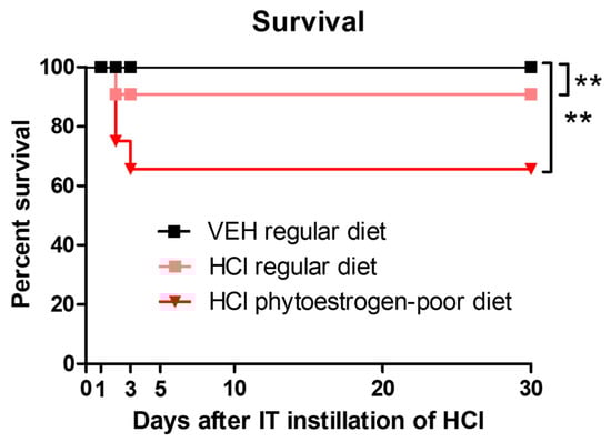 We observed a mortality rate of 0 and 9% for mice on regular diet exposed to saline or 0.1 N hydrochloric acid, respectively. Mice on phytoestrogen-free diet that received HCl exhibited significantly higher mortality, 38% (Figure 1).