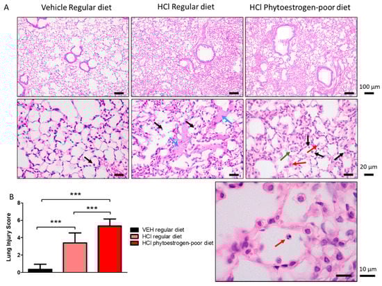 HCl-instilled mice on isoflavone-poor diet showed more severe signs of lung injury (Figure 2A,B). In addition to monocytes (black arrows), neutrophiles were observed to infiltrate the alveolar spaces (red arrows), as was granuloma formation inside the alveolus (green arrows).