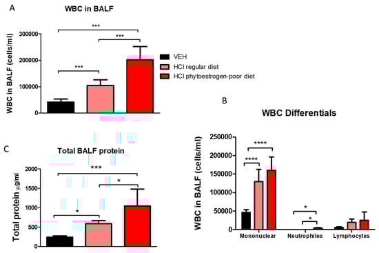Moderate alveolar inflammation was also reflected in increased concentrations of leucocytes and proteins in BALF of HCl-instilled mice on phytoestrogen-poor diet, and significantly less in HCl-instilled mice on normal diet, whereas baseline values were observed in mice on regular diet receiving saline (Figure 3A). A similar trend was observed in total protein concentration with a significant increase in both groups instilled with 0.1 N HCl, but substantially more in mice on phytoestrogen-poor diet (Figure 3C). Following acid instillation, the proportion of monocytes and alveolar macrophages increased in mice of both groups, while the level of neutrophils was significantly higher in the phytoestrogen-poor group (Figure 3B).