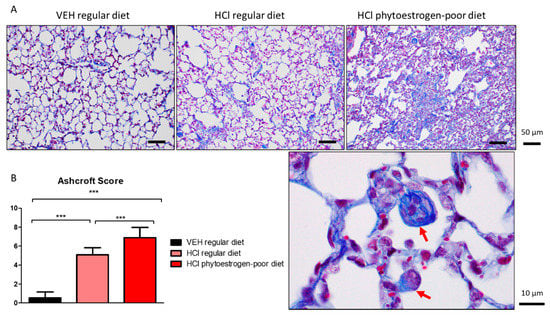 HCl induces pulmonary fibrosis. (A) Masson’s Trichrome staining of lung sections demonstrates moderate collagen deposition in regular diet-fed HCl-instilled mice and total fibrous obliteration, and loss of parenchymal architecture in isoflavones-poor diet-fed mice. (B) The Ashcroft score depicts severe fibrosis in HCl-instilled mice on phytoestrogen-free diet, a milder pathology in HCl-instilled mice on regular diet and no significant changes in saline-instilled mice. (Means ± SEM; n = 3; ***: p < 0.001; with one-way ANOVA and Tukey’s); VEH: Vehicle.