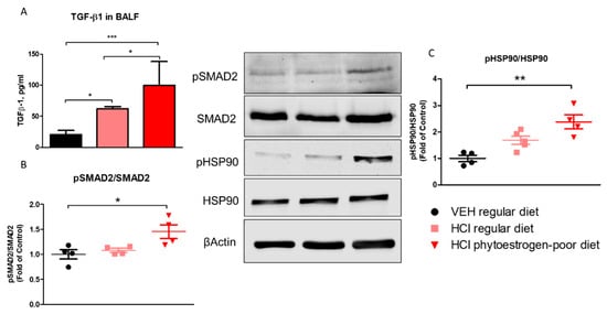 TGF-β levels and activation of intracellular pathways of TGF-β 30 days after HCl instillation. (A) Mice treated with HCl displayed increased expression levels of TGF-β1 in bronchoalveolar lavage fluid (BALF) compared to saline. The levels of TGF-β1 in mice on phytoestrogen-poor diet is significantly higher compared to mice on regular diet. (B) Active (phosphorylated) SMAD2 was significantly increased in mice on isoflavone-poor diet but not in animals on regular diet. (C) Heat Shock Protein 90 activation (pHSP90) increased only in phytoestrogen-poor fed mice. Means ± SEM; ***: p < 0.001, **: p < 0.01, *: p < 0.05 with one-way ANOVA and Tukey’s, n = 8–9 (A), n = 4–5 (B,C); VEH: Vehicle.