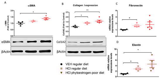 Lung alpha-smooth muscle actin (αSMA) was significantly increased in phytoestrogen-poor-fed, HCl-instilled mice, but not in mice on regular diet (Figure 6A). Collagen Type I levels increased in both HCl-instilled groups compare to control. A similar pattern was observed with elastin mRNA levels. Fibronectin, one more key extracellular matrix protein, showed significant increase (mRNA) only in lungs from mice on regular diet.