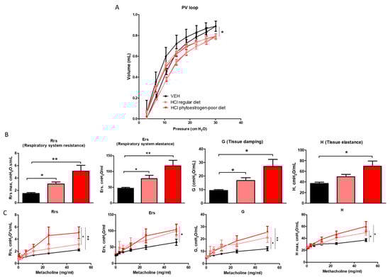 Effect of dietary phytoestrogens on HCl-induced alterations in lung mechanics. Phytoestrogen diet had a significant impact on preventing a downward shift of pressure volume (PV) loops after HCl instillation (A). Respiratory system resistance (Rrs), elastance (Ers), tissue elastance (H), and damping (G) increased, compared to control mice in all groups instilled with HCl (B,C). Means ± SEM; n = 6 mice per group; *: p < 0.05, **: p < 0.01, with one- or two-way ANOVA and Tukey’s; VEH: Vehicle.