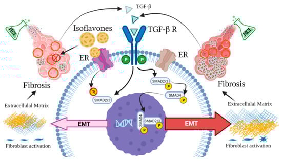 Estrogen-dependent signaling pathways mediating HCl-induced pulmonary fibrosis. Dietary phytoestrogen isoflavones modulate alveolar inflammation and block TGF-β SMAD signaling through activation of estrogen receptor (ER), preventing fibroblast activation and overexpression of extracellular matrix.