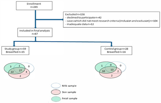- Łoś-Rycharska, E.; Gołębiewski, M.; Sikora, M.; Grzybowski, T.; Gorzkiewicz, M.; Popielarz, M.; Gawryjołek, J.; Krogulska, A. A Combined Analysis of Gut and Skin Microbiota in Infants with Food Allergy and Atopic Dermatitis: A Pilot Study. Nutrients 2021, 13, 1682. [Google Scholar] [CrossRef] [PubMed]