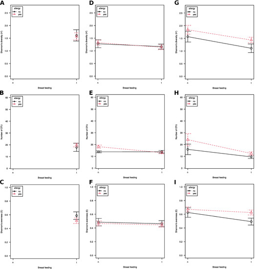 | Allergic: breastfed vs formula-fed | feces | Blautia Eschericha-Shigella OTU1 (Escherichia-Shigella) OTU52 (Peptostreptococcaceae) OTU55 (Lachnospiraceae) | formula-fed > breastfed | 0.025 0.04 0.04 0.02 0.02 |
