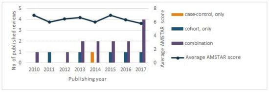 Overview of the number of published systematic reviews and the average AMSTAR (A MeaSurement Tool to Assess Systematic Reviews) score in the systematic reviews according to publishing year.