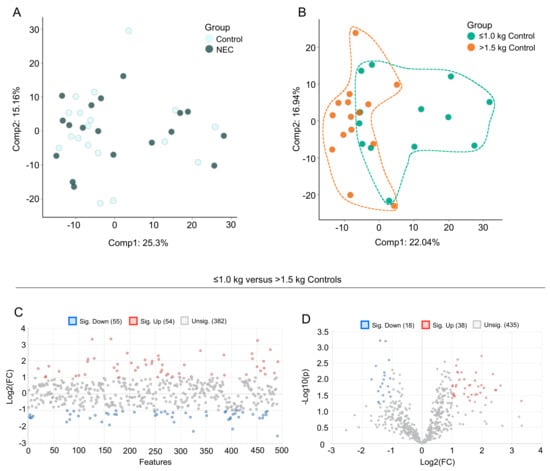 Principal component analysis (PCA) and fold change analysis of human milk samples. PCA of the data reveals (A) segregation of breast milk samples from mothers of control infants and infants with NEC and (B) segregation of breast milk samples from mothers of control infants with birth weight ≤1.0 kg compared with birth weight >1.5 kg. (C) Fold change analysis of the absolute value of change between the ≤1.0 kg versus >1.5 kg birth weight control groups using a fold change threshold of 2.0. (D) Volcano plot analysis of ≤1.0 kg versus >1.5 kg birth weight control groups using a fold change threshold of 2.0 and p < 0.05.