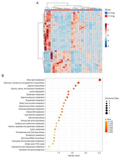 Heat map and enrichment analysis of control group human milk samples. (A) Hierarchical clustering heat map of the top 50 differentially expressed metabolites in the ≤1.0 kg (blue) versus >1.5 kg (red) birth weight control groups by T-test. (B) Quantitative enrichment analysis reveals the top 25 enriched metabolite sets in the milk of mothers with infants ≤1.0 kg birth weight compared with >1.5 kg birth weight.