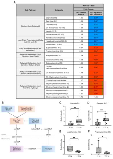 Maternal milk composition of fatty acids (FA) influences neonatal growth, development and immune function and can be impacted by the dietary intake of the mother. Several medium-chain FA and long-chain polyunsaturated FA (e.g., caproate (6:0), caprylate (8:0), caprate (10:0) and hexadecatrienoate (16:3n3)) were significantly lower in concentration in maternal milk in the ≤1.0 kg control group when compared to the >1.5 kg control group (Figure 3A,C,D). Long-chain fatty acids (LCFA) destined for oxidation are conjugated to carnitine and the acylcarnitines are then transported into the mitochondria for fatty acid beta-oxidation (Figure 3B). We observed several carnitine-conjugated fatty acid metabolites such as acetylcarnitine (C2) (Figure 3E) and propionylcarnitine (C3) (Figure 3F) to be significantly higher in the ≤1.0 kg control group when compared to the >1.5 kg control group. Overall, no significant differences in FA were identified between the NEC and control groups.