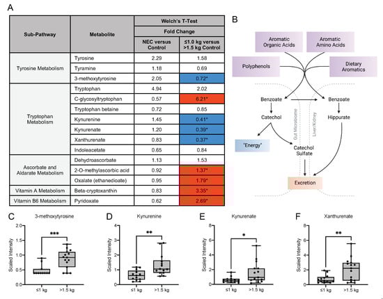 Interactions with the intestinal microbiome facilitate the metabolism of aromatic amino acids, such as phenylalanine, tyrosine and tryptophan and vitamins [,]. In our analysis, no significant differences in the fold change concentration of tyrosine, tryptophan or vitamin metabolites were detected in the milk from mothers of infants with NEC compared with healthy control infants (Figure 6A). Prior studies have implicated the importance of endogenous tryptophan metabolites in maintaining intestinal homeostasis related to the metabolic activity of the gut microbiota and mucosal immune reactivity (Figure 6B) []. Our untargeted analysis detected significant differences in fold change concentration in several of these metabolites among the control groups. The tyrosine metabolite 3-methoxytyrosine was significantly lower in the ≤1.0 kg control group compared with the >1.5 kg control group (Figure 6C). The tryptophan metabolite C-glycosyltryptophan, which has a known associated increase with chronological age in humans, was significantly increased in the ≤1.0 kg group []. However, the fold change concentration of several tryptophan metabolites was significantly decreased in the ≤1.0 kg group when compared to the >1.5 kg birth weight control, including kynurenine, kynurenate and xanthurenate (Figure 6D–F).