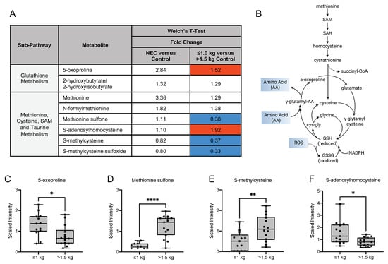 Oxidative stress can occur in the setting of an imbalance between free radical or reactive oxygen species (ROS) and antioxidant defenses. Several markers of oxidative stress have been identified in human breast milk []. Therefore, we next investigated breast milk metabolites from sub-pathways related to glutathione metabolism and methionine, cysteine, S-adenosylmethionine (SAM) and taurine metabolism (Figure 7A). Methionine, an essential amino acid, is a source of cysteine, which is required for glutathione synthesis (Figure 7B) [,]. Cysteine is considered an essential amino acid in preterm neonates, due to the decreased ability to convert cystathionine to cysteine []. Analysis of oxidative stress-related metabolites derived from the glutathione pathway revealed no significant difference was observed between the NEC and control groups. A significantly increased concentration of 5-oxoproline was observed in the ≤1.0 kg control group when compared to the >1.5 kg control group (Figure 7C). Oxidative stress-related metabolites related to methionine, cysteine, SAM and taurine metabolism also demonstrated notably significant differences between the two control groups. Methionine sulfone (Figure 7D), S-methylcysteine (Figure 7E), and S-methylcysteine sulfoxide were decreased in the concentration of milk from mothers of infants with birth weight ≤1.0 kg when compared to the >1.5 kg birth weight control group. In contrast, S-adenylhomocysteine (Figure 7F) was significantly increased in the ≤1.0 kg control group when compared to the >1.5 kg birth weight control group. Additionally, within the glycolysis, gluconeogenesis and pyruvate metabolism sub-pathway, a significant decrease in the fold change concentration of glucose (0.72; p ≤ 0.05) was observed in the ≤1.0 kg control group when compared to the >1.5 kg control group with no difference between the NEC and control groups. No differences were identified in 3-phosphoglycerate, pyruvate or lactate among any of the studied comparisons. Further, within the TCA cycle sub-pathway, a significant increase in fold change concentration of succinylcarnitine (C4-DC) (2.62; p ≤ 0.05) was observed in the ≤1.0 kg control group when compared to the >1.5 kg group, with no difference identified between the NEC and control groups. These findings provide greater insight into the potential nutritional outcomes and disease risks in infants receiving milk with varying compositions of oxidative stress-related, glycolytic and energy metabolites.