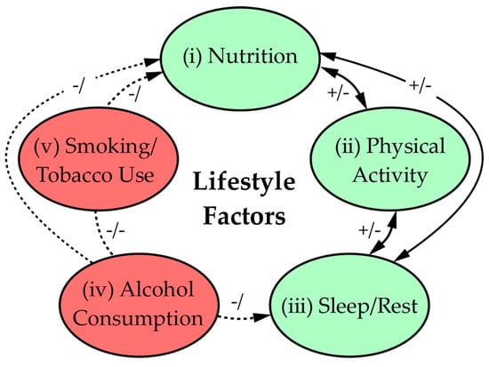 Lifestyle factors that affect clinical health outcomes in COVD-19 infections. Dashed lines indicate negative effects, whereas solid lines connect factors known to improve health outcomes; arrows denote interaction direction(s). Red indicates negative lifestyle factors; green indicates positive factors. (i) Nutrition is essential in supporting immune system function and is affected by other factors positively/negatively (+/−) []. Poor quality rest or lack of physical activity can limit the benefit of nutrition as a health factor (−), and the inverse is true (+). (ii) Physical activity and regular exercise help mitigate disease effects and are related to nutrition and rest similarly []. (iii) Quality sleep and rest contribute to healthy outcomes, and affect and are affected by nutrition and activity. Note that inadequate sleep can induce stress/anxiety that can exacerbate health outcomes (−). (iv) Alcohol consumption leads to organ stress and dysfunction, depresses the immune system response to viral and bacterial infections, and negatively impacts sleep quality (−/) []. (v) Tobacco use has well-known detrimental effects on the immune system and leads to many clinical health problems that exacerbate infectious disease outcomes (−/) []. Smoking and alcohol consumption are often correlated and thus have negative interactions (−/−).