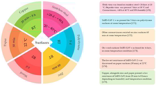 Capacity of SARS-CoV-2 and other viruses to persist on the package surfaces. RT, room temperature: 20–26 °C [,,,,,].
