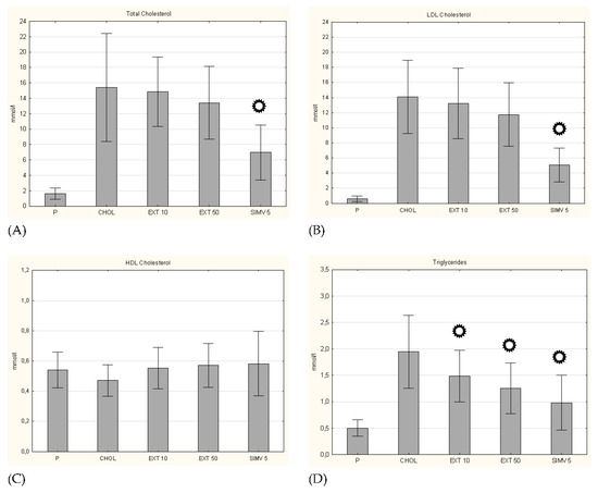 Serum lipid levels. (A) total cholesterol, (B) LDL cholesterol, (C) HDL cholesterol, and (D) triglycerides levels on day 60. of the study. P–standard chow; CHOL–standard chow + 1% cholesterol; EXT 10–standard chow + 1% cholesterol + cornelian cherry extract 10 mg/kg b.w.; EXT 50–standard chow + 1% cholesterol + cornelian cherry extract 50 mg/kg b.w.; SIMV 5–standard chow + 1% cholesterol + simvastatin 5 mg/kg b.w. Values are presented as mean ± SD.