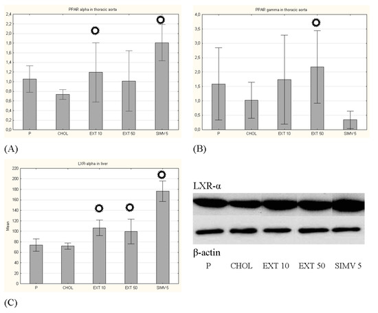 Expression of transcription factors. (A) PPAR-α in aorta, (B) PPAR-γ in aorta, (C) LXR-α in liver. P–standard chow; CHOL–standard chow + 1% cholesterol; EXT 10–standard chow + 1% cholesterol + cornelian cherry extract 10 mg/kg b.w.; EXT 50–standard chow + 1% cholesterol + cornelian cherry extract 50 mg/kg b.w.; SIMV 5–standard chow + 1% cholesterol + simvastatin 5 mg/kg b.w. Values are presented as mean ± SD.