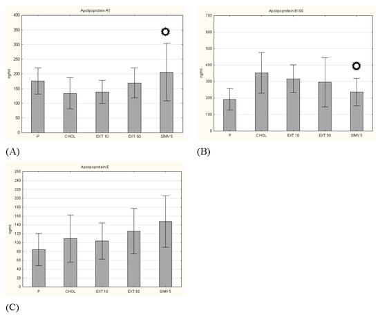 Concentrations of apolipoproteins. (A) apolipoprotein A1, (B) apolipoprotein B100 and (C) apolipoprotein E. P–standard chow; CHOL–standard chow + 1% cholesterol; EXT 10–standard chow + 1% cholesterol + cornelian cherry extract 10 mg/kg b.w.; EXT 50–standard chow + 1% cholesterol + cornelian cherry extract 50 mg/kg b.w.; SIMV 5–standard chow + 1% cholesterol + simvastatin 5 mg/kg b.w. Values are presented as mean ± SD.
