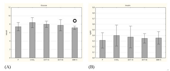 Concentrations of (A) glucose and (B) insulin. P–standard chow; CHOL–standard chow + 1% cholesterol; EXT 10–standard chow + 1% cholesterol + cornelian cherry extract 10 mg/kg b.w.; EXT 50–standard chow + 1% cholesterol + cornelian cherry extract 50 mg/kg b.w.; SIMV 5–standard chow + 1% cholesterol + simvastatin 5 mg/kg b.w. Values are presented as mean ± SD.