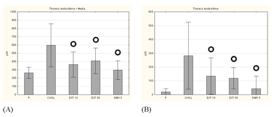 The overall positive effect of cornelian cherry extract on detrimental changes induced by a cholesterol-rich diet was confirmed by a decrease in intima and media thickness and the intima/media ratio in the thoracic and abdominal aorta observed in both groups (higher efficacy in the EXT 50 group). Thickening of the arterial wall, especially of the intima layer, is regarded as a risk-marker of atherosclerosis and is described as one of the earliest vascular pathologies observed in microscopic assessment during atherogenesis [85]. Comparable outcomes were obtained by Sozański et al. in another Cornus mas fruits study [4,86].