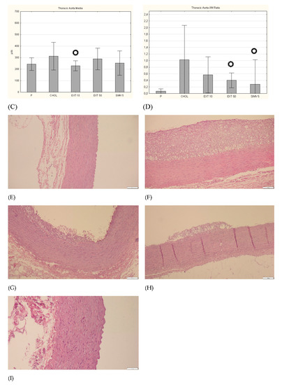 p < 0.05 vs. CHOL. Representative cross-sections of the thoracic aorta segments, stained with hematoxylin-eosin in the (E) P group, (F) CHOL group, (G) EXT 10 group, (H) EXT 50 group and (I) SIMV 5 group.