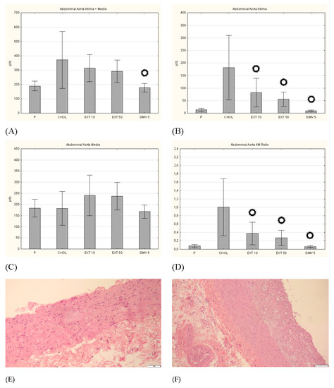 p < 0.05 vs. CHOL. Representative cross-sections of the abdominal aorta segments, stained with hematoxylin-eosin in the (E) P group, (F) CHOL group, (G) EXT 10 group, (H) EXT 50 group and (I) SIMV 5 group.