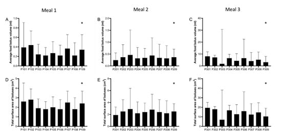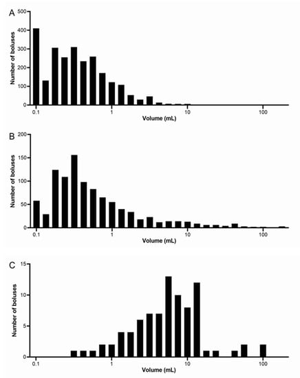 For each meal, the average volume of food boluses was calculated for each participant and the data are shown in Figure 3B. The volumes of food boluses were markedly different for the different meals with the median (IQR) values being 0.47 (0.43–0.63) mL for Meal 1, 2.4 (2.0–3.6) mL for Meal 2 and 13.60 (7.8–17.4) mL for Meal 3. The difference in average volume of food boluses was significantly different between meals (Kruskal–Wallis test p < 0.0001). Post hoc analysis showed a significant difference between Meal 1 versus Meal 2 (Dunn’s multiple comparison test p < 0.05) and Meal 1 versus Meal 3 (Dunn’s multiple comparison test p < 0.0001). For Meal 1, the smallest bolus measured was 0.02 mL and the largest 12.4 mL. For Meal 2, these were, respectively, 0.05 and 161 mL and for Meal 3, respectively 0.3 and 119 mL.