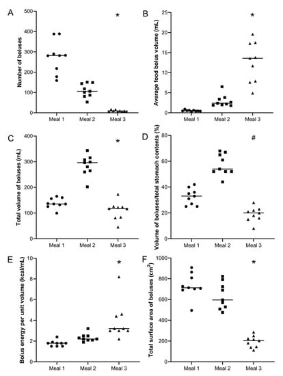 Summary data for each participant and meal. (A) Number of food boluses. (B) Average food bolus volume. (C) Total volume of food boluses. (D) Ratio boluses volume/total stomach contents volume (%) and (E) Bolus energy per unit volume (kcal/mL). (F) Total (cumulative) surface area of boluses. Meal 1: chicken and vegetables, n = 9 healthy participants. Meal 2: bread, n = 9 healthy participants. Meal 3: cheese and yogurt, n = 9 healthy participants. The horizontal lines indicate the median. * p < 0.0001 Kruskal–Wallis test; # p < 0.0001 1-way ANOVA.